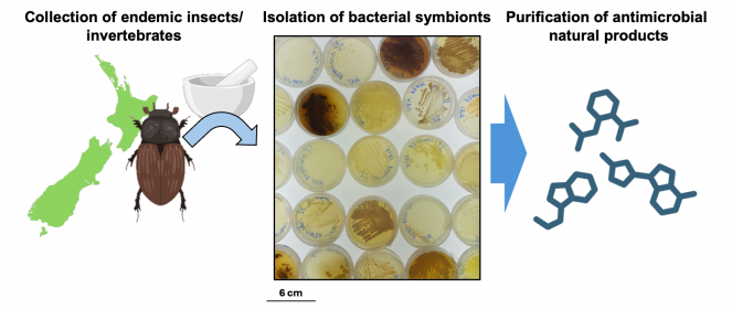 Dr Little has been awarded a Marsden Fund Fast-Start grant to explore the untapped chemical potential of Aotearoa New Zealand’s insect symbionts, the bacteria that live on and inside our native insects. Some insect symbionts produce bioactive products that defend their hosts from infection, but this capability has not been explored in symbionts of our country’s own unique insect species. After receiving approval from mana whenua, Dr Little and his team will collect a diverse range of native insects and screen their bacterial partners for antimicrobial activity. They will then sequence the genomes of the bacteria with the greatest potential for producing bioactive compounds. Candidate antimicrobials will be isolated and characterised in more detail.
