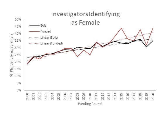 Figure 2: The percentage of responding Principal Investigators identifying as Female in the Marsden Fund.