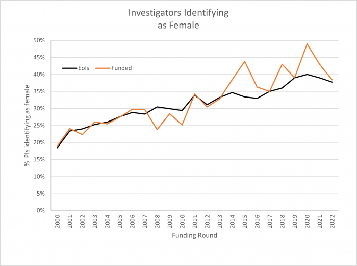 Figure 2: The percentage of responding Principal Investigators identifying as Female in the Marsden Fund for the 2022 round.