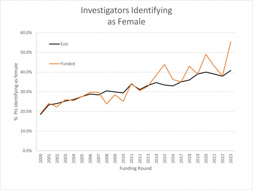 Figure 2: The percentage of responding Principal Investigators identifying as Female in the Marsden Fund for the 2023 round.