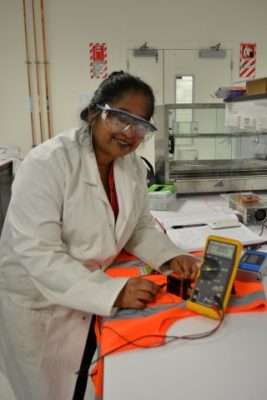 Her individual project included building a credit card sized fluorometer using simple LEDs and LDRs under the guidance of the innovative Honours student Jake Martin. Using this simple instrument, she measured the changing levels of fluorescence in high visibility safety jackets after repeated washes. She hopes to further use this gadget and data in her classroom to enable students to research on the production of long lasting Hi Viz apparel.