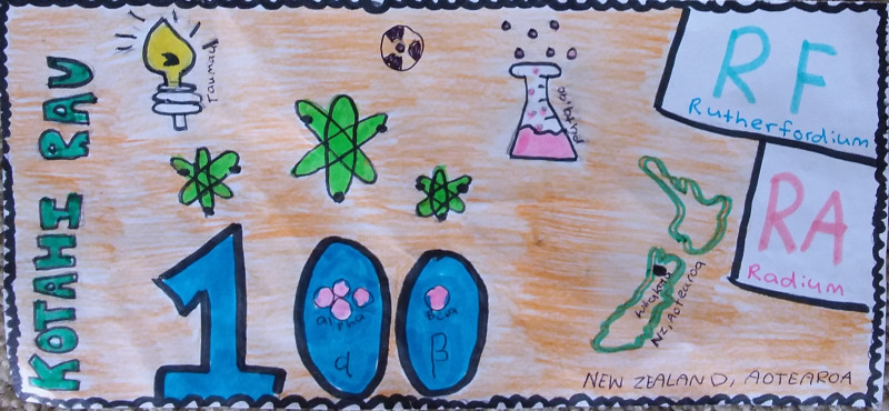 "I decided to take part in this competition because it gave me something to do during the lockdown and now I know more about Ernest Rutherford as well. I chose to colour in my note yellow because Rutherford’s favourite experiment was the gold foil one, which is why the background is yellow because of the foil. Around my border I have little atoms, in fact, I have 150 of them to celebrate his 150th birthday. The atoms are pink and blue because that is the colour Rutherford wanted them to be. On the left-hand side, I’ve got the model of the atom as it was his favourite part of the atom experiment. On the right hand, I have the radioactive symbol because he created the rules of radioactiveness. I have New Zealand Aotearoa because his home country is Brightwater, Nelson where he grew up with his 11 siblings. I’ve also got beakers and jars indicating science and physics because they were both his favourite subjects at his 7 universities. My 100 is the periodic table designs, representing Rutherfordium and radium. Ernest Rutherford matters because of the atom and radioactive experiments because of the neutrons, electrons, alpha, and beta results. I chose to do 4 Māori words, discovery - taumau, science - pūtaiao, New Zealand - Aotearoa, and 100 - kotahi rau. I chose to do discovery and science because that is what made Rutherford and that is what brought him together. I chose New Zealand because that was his home country and I chose 100 because I designed the $100 note."