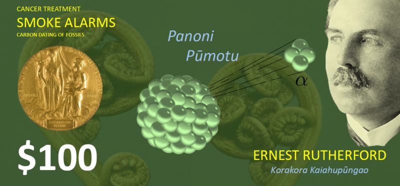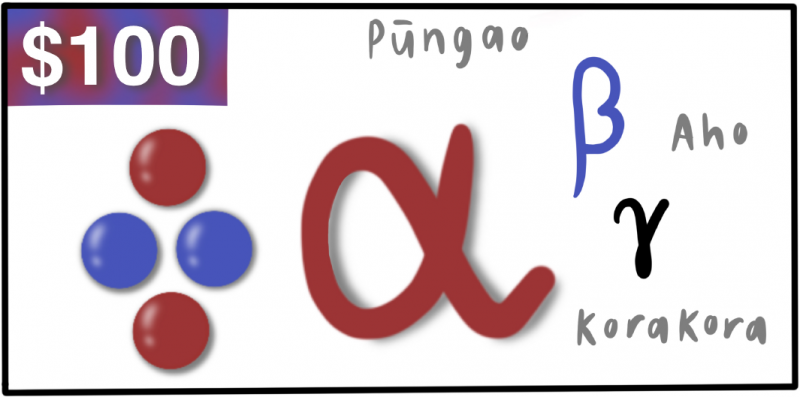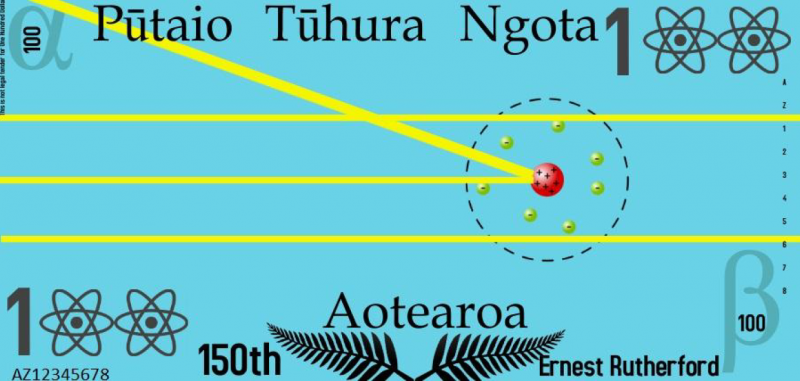 "On my redesign of the $100 note I included the symbols (greek letters) for alpha, beta, and gamma rays. Whilst Ernest Rutherford did not discover any of these rays, he was the one who named them. Rutherford also worked extensively with alpha particles and this eventually led him to discover the structure of the atom. It was by bombarding a piece of gold foil with alpha rays that he found the atomic nucleus. I chose the word ‘pūngao’ because all these rays have energy associated with them. I chose the word ‘aho’ because gamma radiation and light are both electromagnetic radiation. I finally chose the word ‘korakora’ because alpha and beta rays are in fact particles, alpha is a helium nucleus and beta is an electron (or sometimes a positron - an anti-electron)."