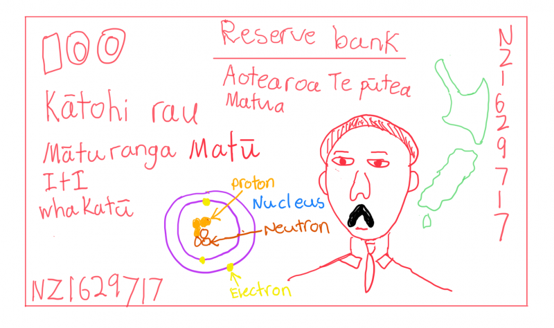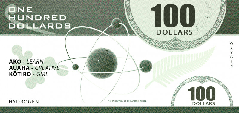 "My $100 bill shows the Rutherford model of an atom roughly centred on Nelson where Rutherford was born. It also shows as a picture of his lab where he discovered that the atom isn’t like a blueberry muffin in which the protons fit inside a big electron but instead that the atom has a nucleus and electrons orbiting it. I chose the whakatauki “Iti rearea teitei kahikatea ka taea" (although small, the bellbird can achieve great heights) because Rutherford was born in small-town New Zealand which at the time only had a population of 256,393 people but yet he managed to disprove a theory that had been around since 1904 and so he would be like the small bellbird climbing up the tall kahikatea."
