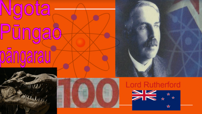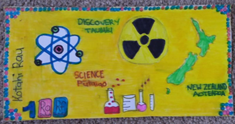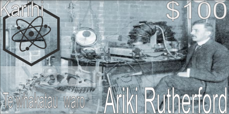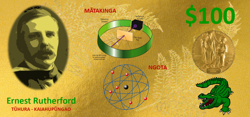 "We added the picture of Lord Rutherford because he is part of the traditional NZ $100 dollar note. We added an atom because Lord Rutherford was the discoverer of the nucleus. We added a dinosaur because his discoveries and theories led to the invention of carbon dating. We added the Māori words because they mean things that Ernest Rutherford is good at. Ngota is atom. Pūngao means energy. Pāngarau means mathematics. We added the picture of the NZ flag because that is where Lord Rutherford was born."