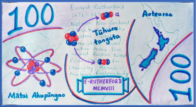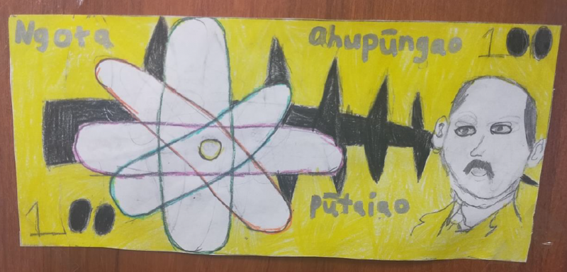 "This is my design! First, this is 100, kotahi rau, it means $100. Second, here are three Māori kupu: mātauranga matu means chemistry; iti means small, the atom is very very small, it is invisible; Whakatū means Nelson because Rutherford was born in Nelson. Third, this is my money. Fourth, this is the structure of the atom. Before Rutherford, other scientists thought that atoms were like watermelons with many seeds that fit inside. However, Rutherford discovered that inside the atom there is a very small nucleus just like a peach. Fifth, this is Ernest Rutherford I drew, this is the Reserve Bank of Aotearoa Te Pūtea Matua, this is the money number again!"
