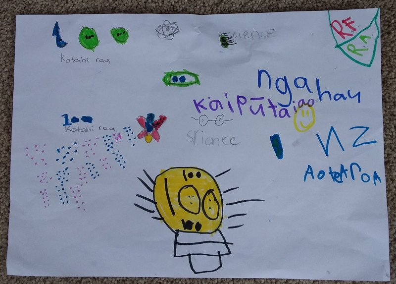 "I had lots of fun colouring my design. The three Māori words I used are kaipūtaiao, which is scientist in English. The second word I used is ngahau which means interesting. The third word I used is Aotearoa meaning New Zealand. I chose scientists because Ernest Rutherford was a scientist. I chose interesting because his science is interesting and I like it, and I chose New Zealand Because he lived and was born there. I showed how Ernest Rutherford mattered by drawing some science beakers, a lightbulb and a model of an atom. He mattered because he did lots of cool science and created some new things to do with science. On my note, I also added RF and RA For the periodic table elements, and I added 150 blue and pink dots to represent his 150th birthday. His favourite colour is green so coloured some things in green."