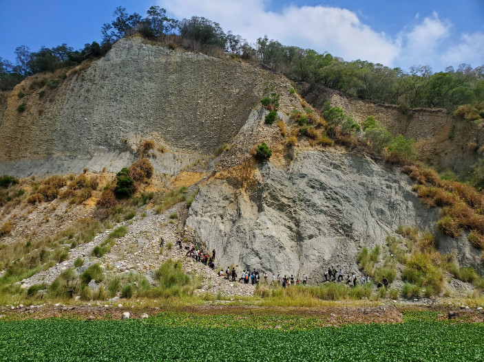 A photograph of the exposed Sanyi fault on the north bank of the Dajia River. Along the main fault zone, the gently east-dipping Miocene Kueichulin sandstone is thrusting onto the flat-lying Pleistocene Toukoshan conglomerates and late Quaternary alluvial deposits. Climbers marked the location of the main fault zone. Credit: Li-Wei Kuo