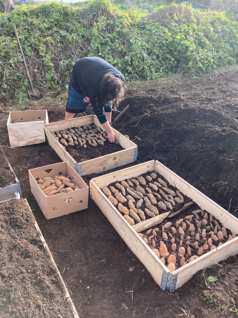 Setting out purapura / seed kūmara in a pārekereke 2020