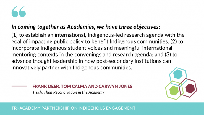 In coming together as Academies, we have three objectives: (1) to establish an international, Indigenous-led research agenda with the goal of impacting public policy to benefit Indigenous communities; (2) to incorporate Indigenous student voices and meaningful international mentoring contexts in the convenings and research agenda; and (3) to advance thought leadership in how post-secondary institutions can innovatively partner with Indigenous communities.