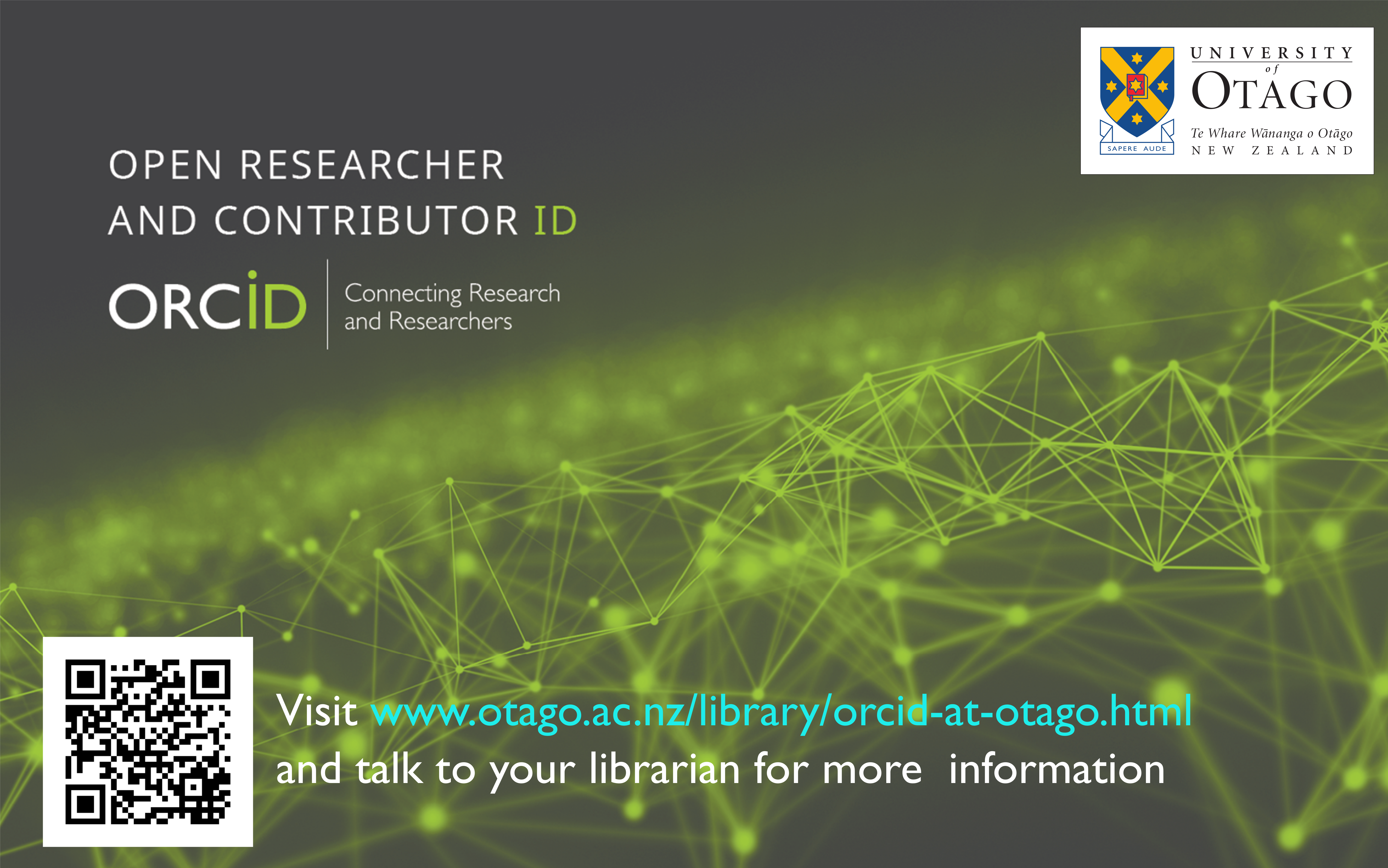 We have adapted some ORCID resources for University of Otago Contact us if you want some tailored to your organisation.- Bookmark design for placement into reserved library books BookmarkBackFinalOtago.pdf BookmarkFrontFinalOtago.pdf