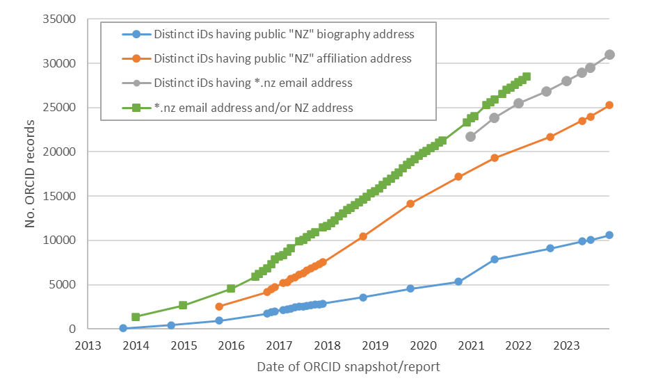 Count over October 2013 to the end of 2023 of unique ORCID iDs affiliated with New Zealand, in either their biography, education, employment, and/or email address.