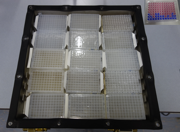 Figure 2: Growth chamber. Each column on every plate contains a dilution-to-extinction series, where the final well with growth is taken forward to the next stage to obtain pure cultures. Inset in top-right shows a resazurin plate that allows researchers to confidently determine the final well with bacterial growth by the colour change of resazurin from blue to red due to the reduction of growth media from microbial growth.