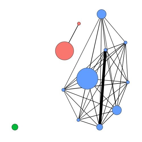 Figure 3: A network analysis of Aquificales isolates from Kuirau Park, Rotorua. Each coloured circle represents a group of Aquificales isolate genomes, with the size of the circle representing the number of genomes. Different coloured circles represent the different ecological populations identified through this analysis. The thickness of black lines represents the level of gene flow between these nodes. Note the lack of gene flow between the different coloured ecological populations.
