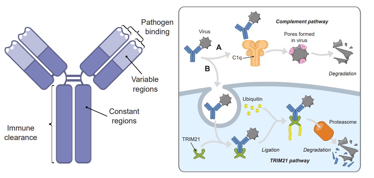 Figure 1: Antibody structure and the clearance of viruses. Each antibody has variable regions that bind to pathogens and constant regions that direct the subsequent immune response. To clear viruses, elements of the complement pathway are recruited to destroy the viral envelope (A), or if the virus enters the cell is it targeted for rapid degradation by the TRIM21 pathway (B).