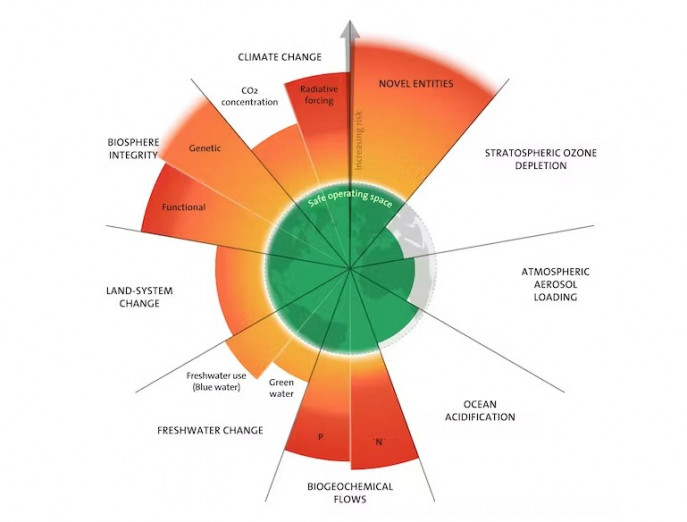Here’s the sum total of our impact on the planet. You can see the areas we’re still within safe limits – and those where we are well past. Azote for Stockholm Resilience Centre based on analysis in Richardson et al 2023, CC BY-ND