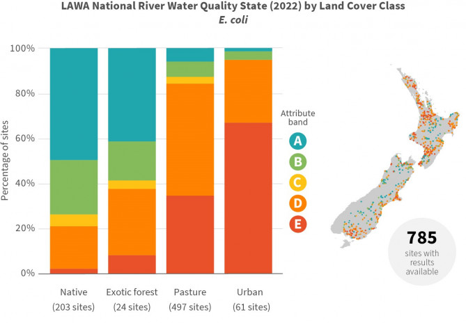 Figure 2. Measurements of river E. coli and their attribute bands across four different land cover classes, for the five-year hydrological period (1 July 2017 – 30 June 2022) at 785 sites. The number of sites with suitable data to determine an attribute band for each land cover class is shown below each bar. The location and attribute band of these monitoring sites is shown on the map. Copyright 2023 by Land, Air, Water, Aotearoa (LAWA). Reprinted with permission.