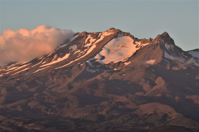 This simple interaction between topography and climate broadly explains the distribution of glacier ice we see both in New Zealand and around the world; the largest glaciers exist where the land surface projects highest above the summer snowline elevation, e.g. Aoraki/Mt Cook. In the North Island, the present-day summer snowline sits at about 2600 m, which is only intercepted by the island’s highest peak, Mt Ruapehu (2797 m). Retention of snow on the summit feeds several glaciers that cover approximately 3 km2 in area.