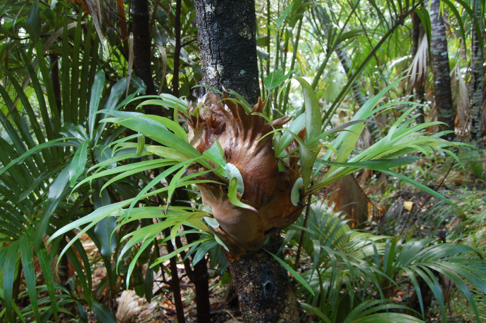 A staghorn fern colony may contain more than 50 individual ferns. Each is anchored to the colony by its “nest” fronds (which dry to a papery brown as they age) and extends elongated “strap” fronds outwards to gather sunlight for photosynthesis and to produce spores for reproduction. Through their field work on Lord Howe Island, Professor Burns and his team have shown that individual colony members differ markedly in the number, form and function of their fronds depending on their position in the colony. For example, those at the top form waxy, fan-shaped nest fronds that collect water and channel it downwards into the colony, while those at the bottom form spongy nest fronds that absorb excess water and store it for later use. Stored water can be distributed between individual colony members when needed thanks to an extensive shared root system. Furthermore, individuals at the top of the colony have more reproductively-active strap fronds than those at the bottom, and 40% of colony members do not appear to contribute to reproduction at all. This dramatic division of labour between individual ferns resembles what is observed in eusocial animals.