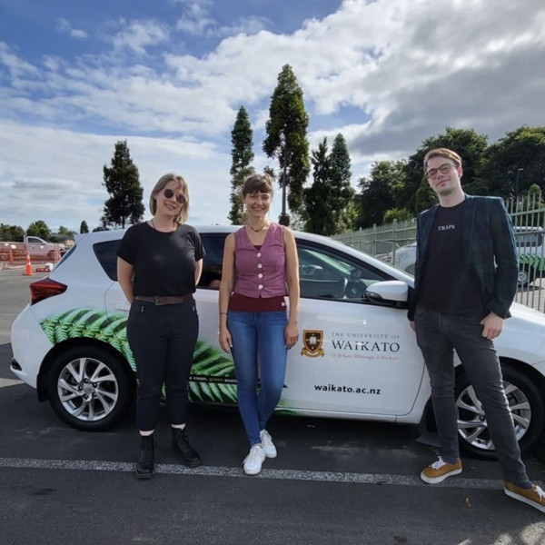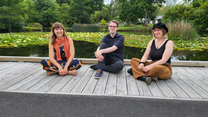 Dr Calude (centre) and PhD students Jessie Burnette (left) and Alex Pohl (right) will visit local schools to find out what Kiwi children in mainstream English language education are making of kupu Māori borrowings entering their variety of English (Photo by Sara Malik).