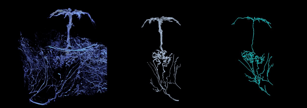 Left: This is an image of the blood vessel network of a rodent uterus captured by micro CT. Middle: Precise 3D details can be extracted using computer-based analysis. Here the researchers reveal arteries feeding a single placenta, the organ feeding the fetus. Right: These precise details are then used to recreate a ‘virtual’ uterus. Images: Supplied.
