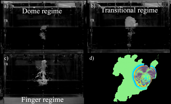 Figure 2: Results from laboratory experiments of compressed air ‘eruptions’ using different strengths for the same water depth. The critical water depth, which leads to maximum wave generation, occurs for eruption strength between the dome regime (a) and the transitional regime (b). Finger regime style eruptions are shown in panel (c). Panel (d) shows the wave field from a simulated eruption on the north-eastern edge of the Horomatangi Reef approximately 5 minutes after the eruption. Red represents positive waves and blue negative waves. Figure provided by Dr Emily Lane.