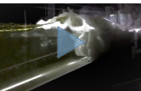 Video 1: Fluidised flow displacing water on impact to generate a significant wave. Direct link: video-1607942084_short.mp4. Video provided by Dr Emily Lane.