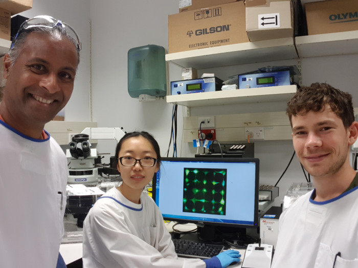 Associate Professor Charles Unsworth, Si Li (PhD) and Nicholas Mellor (PhD) showing an image of a grid network of human astrocytes organised to single-cell precision on a silicon chip. Photo: Supplied