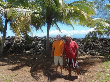 Professor Jeff Sissons and local leader Ato Fogier standing in front of a ruined Marae in Moorea