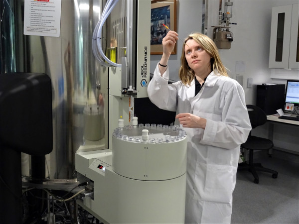 Nuclear magnetic resonance (NMR) spectroscopy is a powerful method for studying proteins and their interactions in molecular detail. Here Dr. Morris loads a protein sample into an NMR instrument to investigate it's structure. She will use this technology to elucidate details of the interactions of proteins linked to Alzheimer's progression.