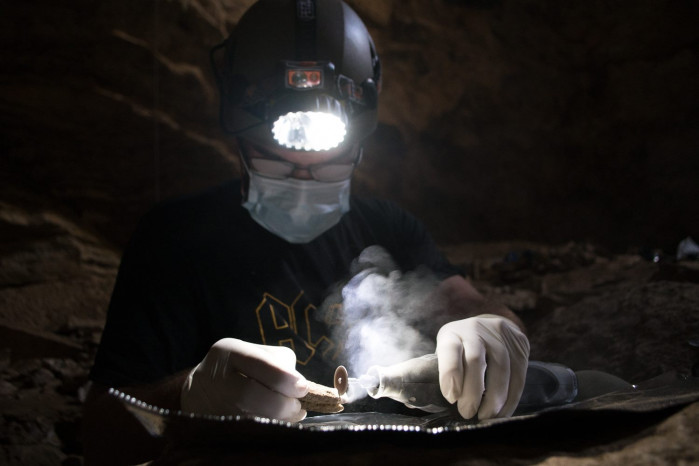 Dr Mitchell collects samples of bone from ice age mammals for ancient DNA analysis. Natural Trap Cave, Wyoming, USA. Photo credit: Hayden Griffith. Photo supplied