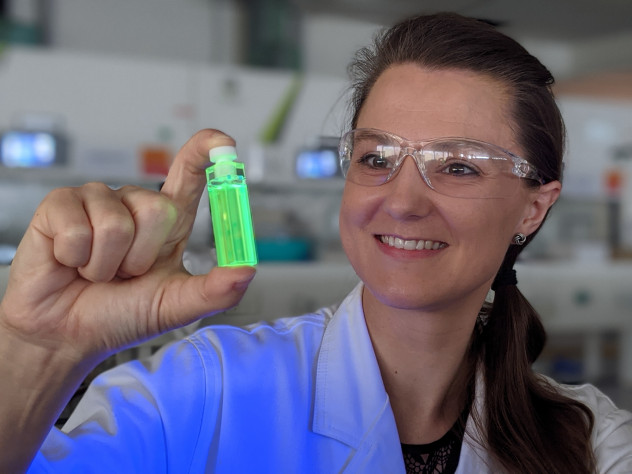 Dr Fleming with a solution of a fluorescent molecule that will be used to track the drug delivery system in cells. Photo supplied