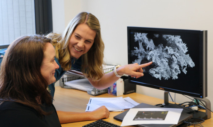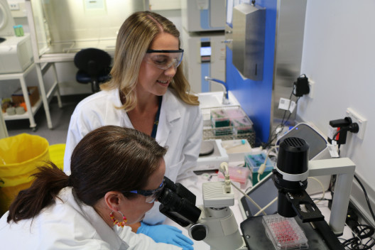 Associate Professors Jo James and Alys Clark (sitting) examine placental cells under the microscope. Photo supplied