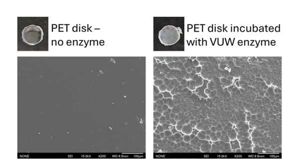 Scanning electron micrograph image of enzyme-degraded PET plastic (image supplied)