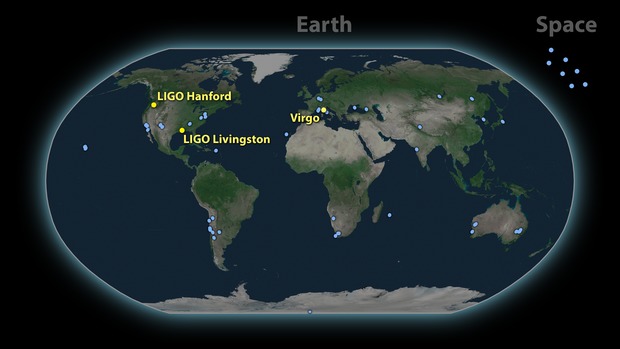 In contrast to black holes, neutron star mergers emit light in the form of a flash of gamma rays and further electromagnetic radiation. An accurate determination of their sky location and distance from the gravitational wave measurement is utterly critical for a follow-up by traditional electromagnetic telescopes. This was possible with the 3 LIGO/Virgo detectors, enabling a frantic follow-up by 70 optical ground-and space-based telescopes that managed to locate the host galaxy at a distance of 140 million lightyears.