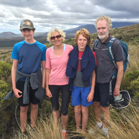 Renate hiking with sons Tim and Sean, and husband Kevin in the Tongariro National Park