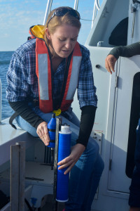 Jenni demonstrates how to mount hydrophones to weighted stand for deployment underwater. Photo: Alison Soss, Gray’s Reef National Marine Sanctuary, NOAA (CC BY-SA 4.0)