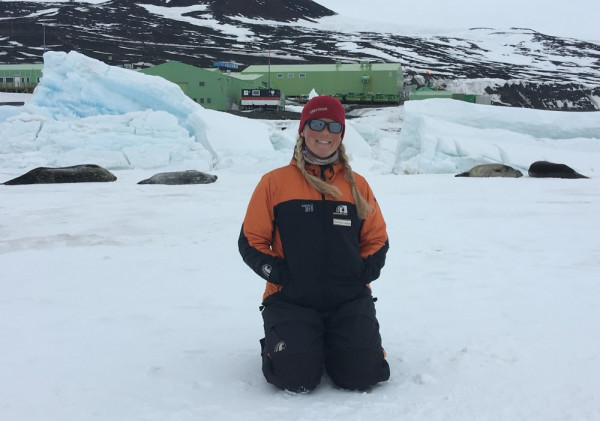 Michelle LaRue leads her postgraduate team of students to learn about the Weddell seals situated outside Scott Base in 2019. Photo credit: Lucy Howell.