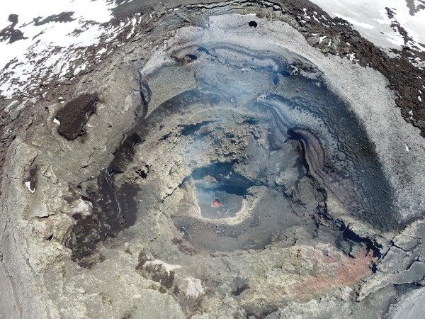 Oblique view into the bottom of the summit crater of Villarrica Volcano, Chile from drone. (Photo credit: Leighton Watson)