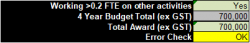 We have introduced a new budget template in 2025 which helps you to alter your budget total if you plan to work more than 0.2 FTE on other activities. e.g. if you are planning to work 0.4 FTE on teaching and 0.2 FTE on service and admin (which totals 0.6 "other FTE") you should enter this as follows at the bottom of the budget tab: