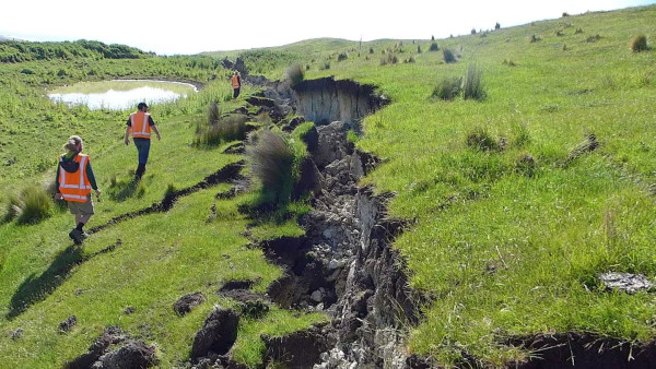 Dr Kearse (foreground) and colleagues walking alongside the surface rupture of the Kekerengu Fault during scientific reconnaissance following the 2016 Kaikōura earthquake. Credit: Julian Thompson.