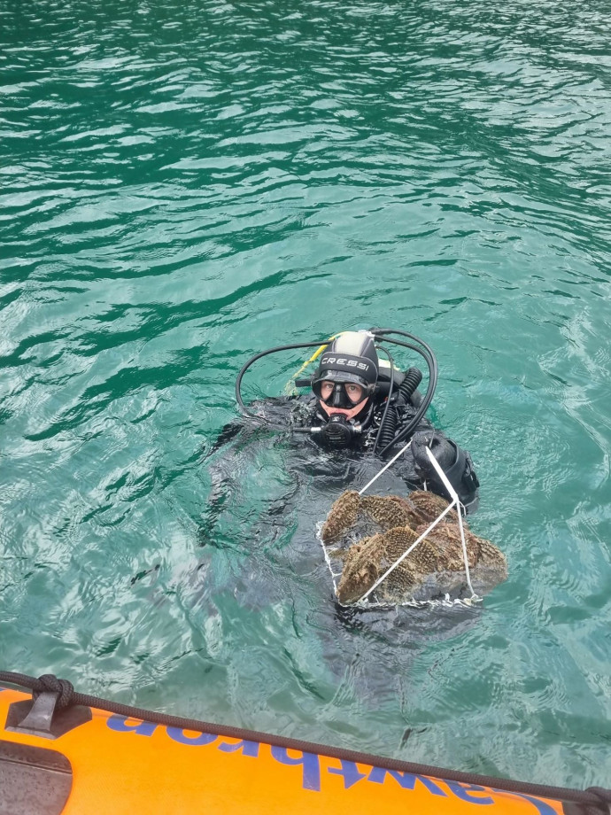 Heading out for a research dive in Duncan Bay. Credit: Nick Hearn; Laboratory enrichment trials set up at the Cawthron Aquaculture Park. Supplied