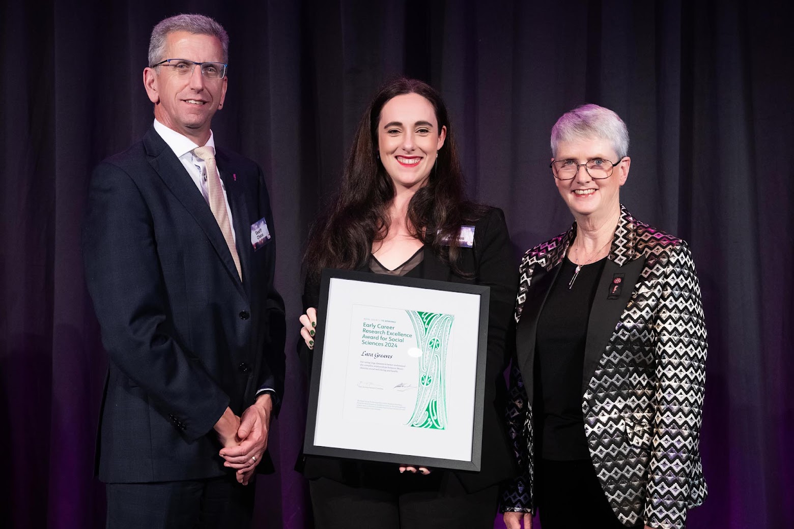 Associate Professor Lara Greaves (Ngapuhi, Pakeha, Tarara) has been awarded the Early Career Research Excellence Award for Social Sciences by the Royal Society Te Apārangi for interrogating large datasets to explore the complex relationships between Māori identity, social well-being and health.