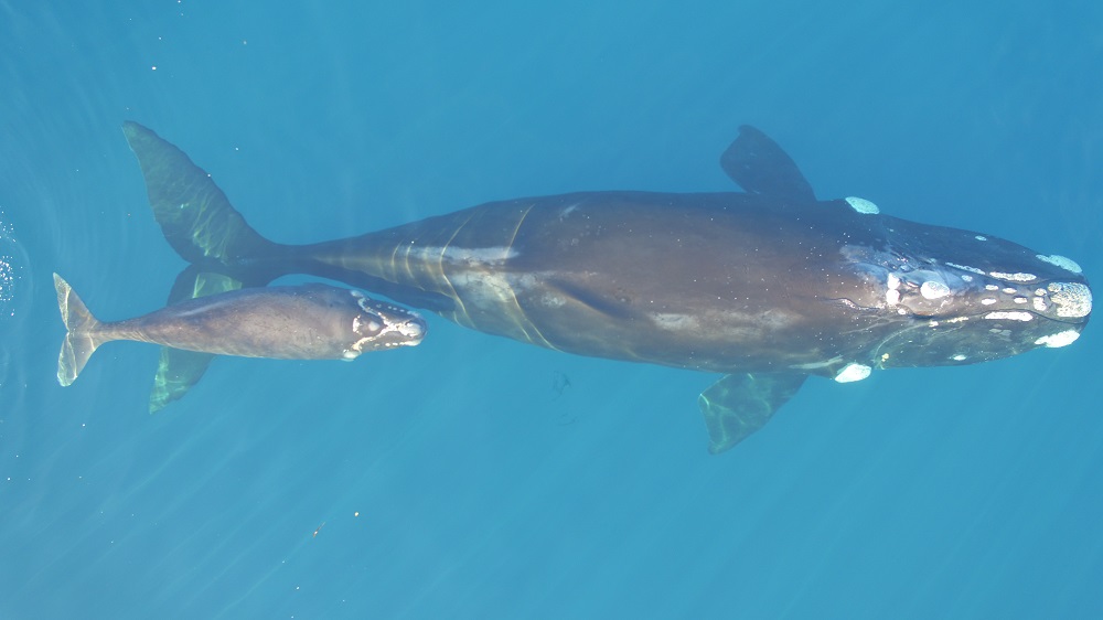 Southern right whale (tohorā) mum and calf at the Auckland Islands. Credit: University of Auckland & tohoravoyages.ac.nz. Photo collected under Department of Conservation permit
