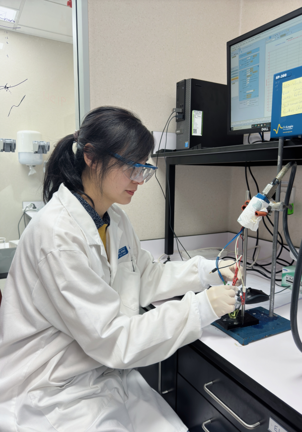 Dr Bicheng Zhu in the laboratory, performing electrochemistry experiments (Supplied)