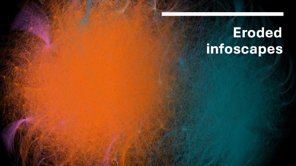The blue clusters, nodes, and links represent those watching livestreams shared on social media by participants in the protest, and supportive commentary. The orange and pink represents those who watched mainstream media coverage and expressed negative sentiments towards protestor action. Over the course of the 23-day parliamentary occupation we observed in real time the increasing correlation of consumption of alternative media/social media as news sources, and support for the occupation, culminating in this mapped informationscape, which reveals significant splintered realities.
