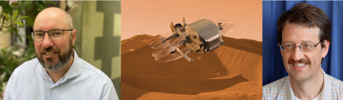 L to R: Dr Courtney Ennis, NASA/John Hopkins artists impression of Dragonfly on Titan, and Professor Jorg Frauendiener.