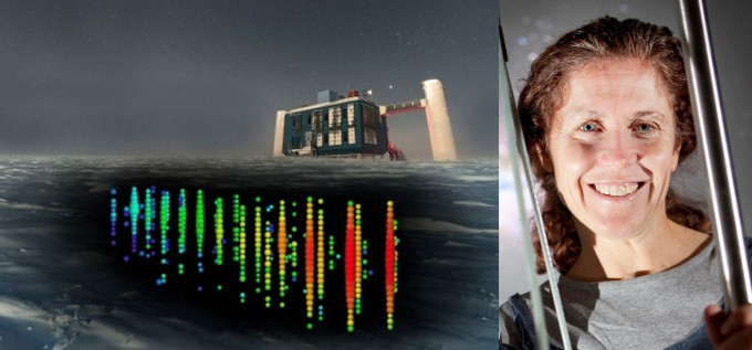 (L) Stock illustration: IceCube neutrino observatory and (R) Professor Jenni Adams.